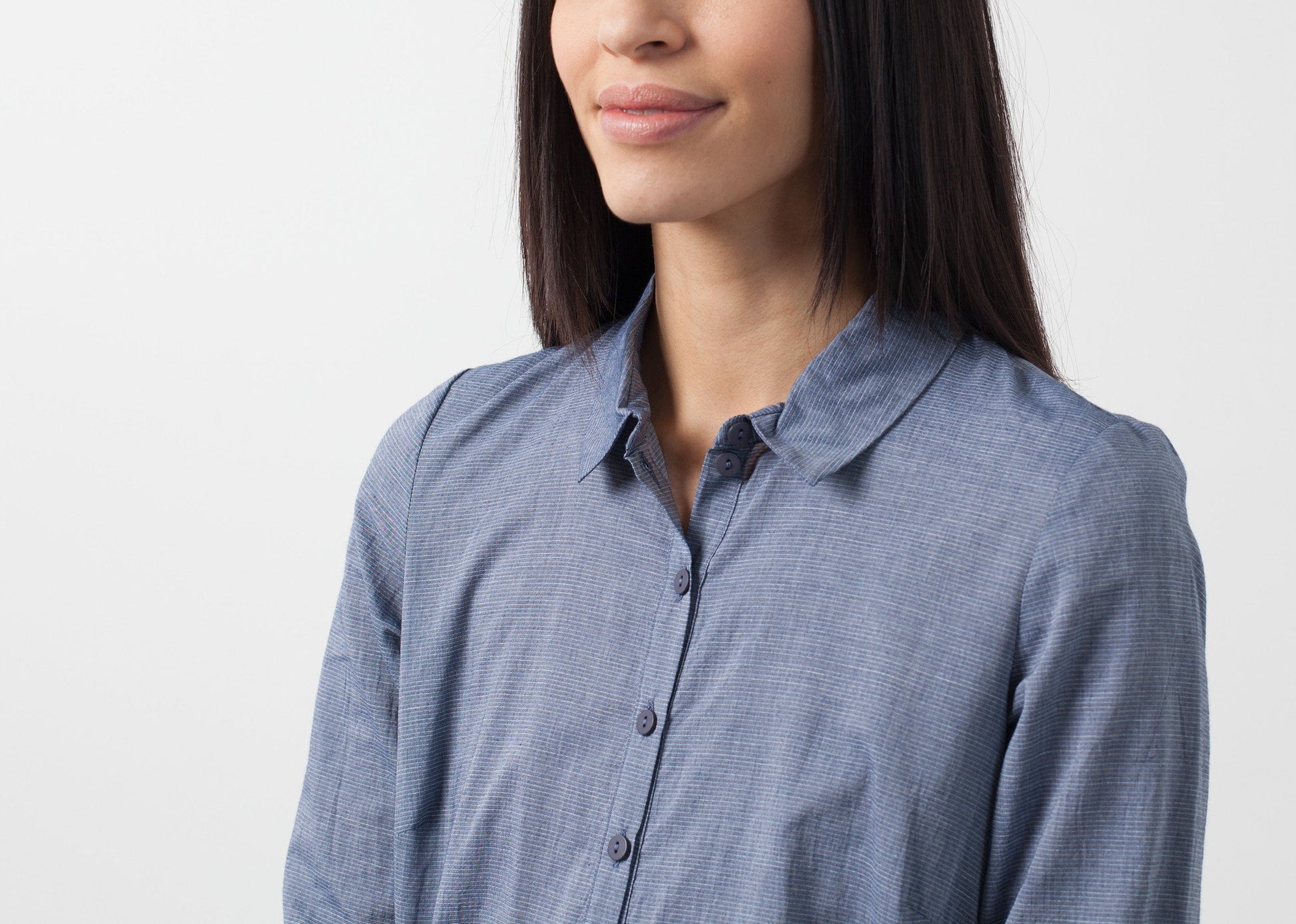 The Romary is a glamified shirtdress with fancy details. Gathered details at sides. Button placket closure at front. Knee length. Lilith. Color Rock. 100% Cotton. Ashley is wearing an X-Small.
